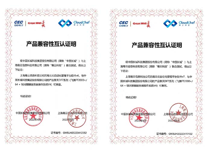 日前,经过中国长城、飞腾的严格的兼容性功能测试、性能测试及安全测试,骞云科技自主研发的“云自动化管理平台软件V6、V7”满足测试要求,成功与中国长城的擎天DF7系列(飞腾FT2000+/64 + 银河麒麟服务器操作系统V4)、飞腾腾云S2500处理器平台完成国产化适配认证,并取得产品兼容性认证证书。