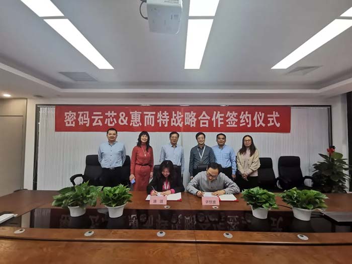 2022年1月19日,北京惠而特科技有限公司与北京密码云芯科技有限公司战略合作签约仪式在惠而特总部隆重举行。密码云芯董事长郭秀民与惠而特董事长谭曙光出席签约现场,双方进行了深入、务实的会谈,并共同见证双方合作协议的成功签署。